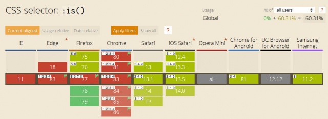 新しい疑似クラスが safari と Firefox のプレビュー版でサポートされるようになったという事で色々と眺めていたのですが、これはSassが使えない環境だととても便利そうですね。とりあえず各ブラウザのサポート状況を見てみると……
