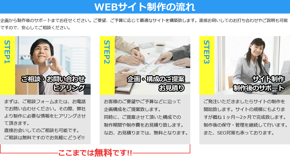 ご要望をお聞かせいただき、最適な制作プランのご提示、お見積りまでは無料です。お気軽にご相談下さい。